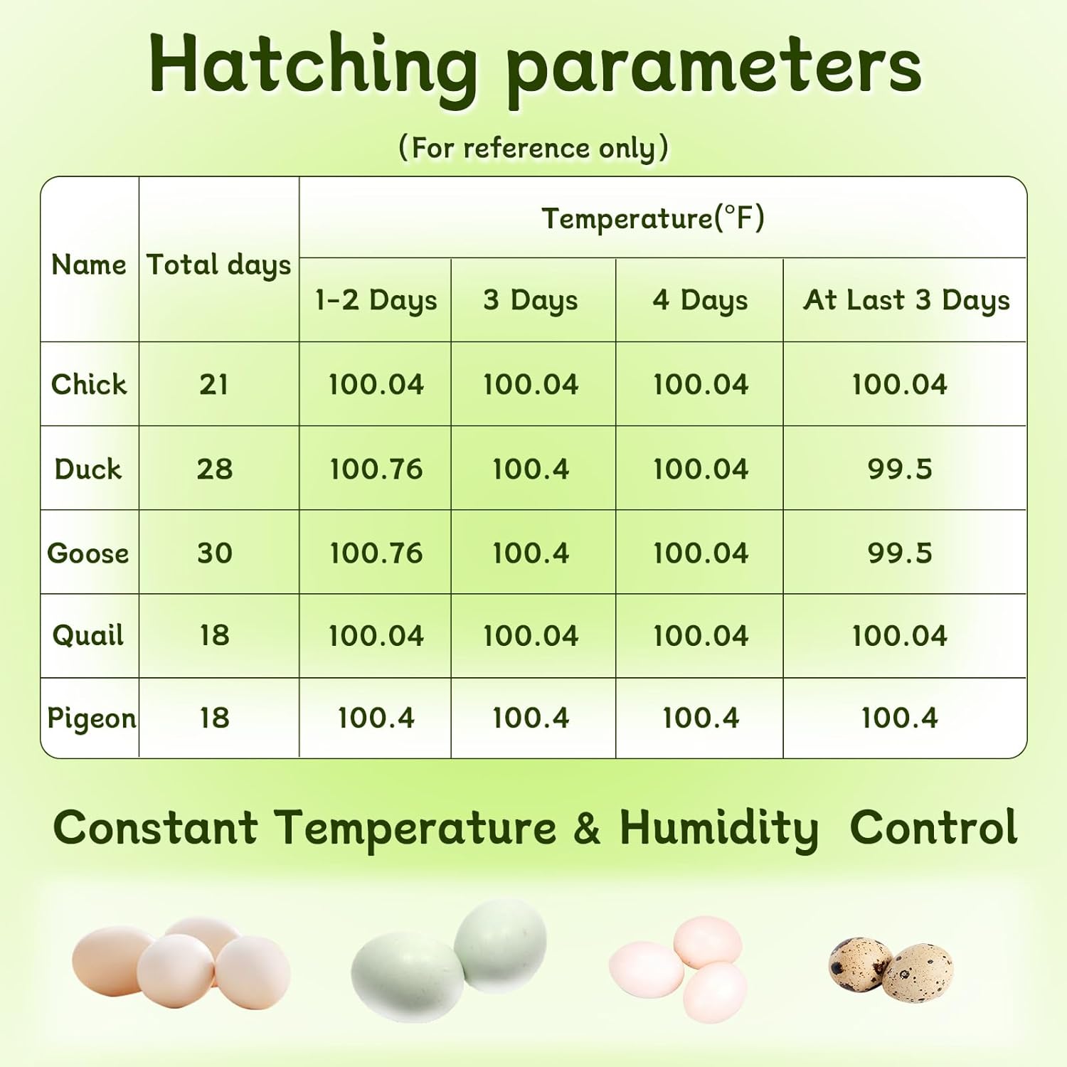 MODUODUO Egg Incubator for 18 Chicken Eggs 8 Goose EggsFeatures:[1]Easy to take apart and clean.[3] During Use-No smells throughout the duration of the process. Solid product, very durable and is neat and tidy.[4]Two Egg Trays-Having the different size trays available is useful for the larger ducks eggs.Specifications:Material: plastics & metalSize: 10.24*10.24*5.51inchColor: Blue & transparentWorking Parameter:Supply Voltage:AC: 110vDC: 12vWattage:50WTips:Please read the booklet which includes valuable information for first timersAbout Use:All you do is set the eggs, add your bottle of water and the incubator has a count of days so no having to keep up with when you started them. It has a candling light on the top also.Attention to the Room Temperature:Keep the bottom piece of foam it comes in in case it’s winter or it gets pretty cold in your room.