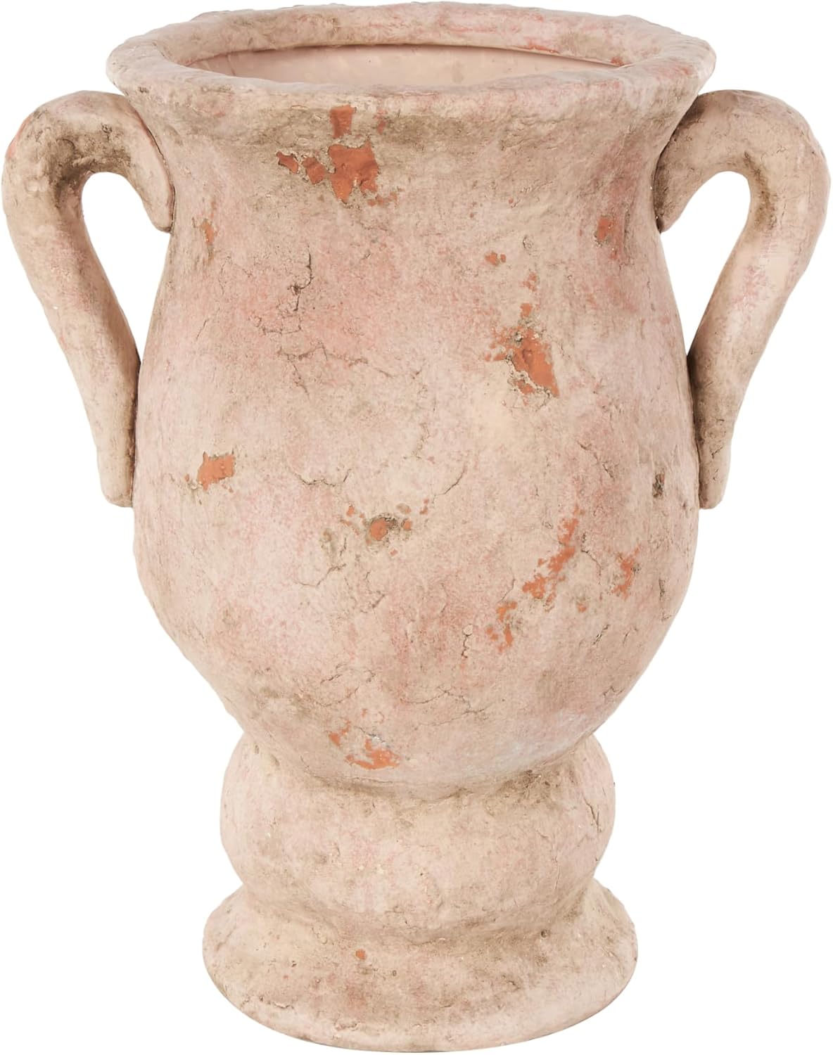 Expertly molded stoneware gives the rustic vase for home decor an authentic aged appearance. With its amphora shape body, wide opening, and curved handles, this distressed cream vase for dried flowers adds timeless elegance to any space. Wipe clean with a dry cloth. The cream centerpiece vase is perfect for enhancing any living room or dining area. Designed with felt or rubber stoppers at the base that prevent scratching furniture and table tops, as well as sliding around. This item ships in 1 carton. Stoneware vase makes a great gift for any occasion. Suitable for indoor use only. This item ships fully assembled in one piece. This is a single cream colored vase. Rustic style. Vase has a 8 in mouth opening.