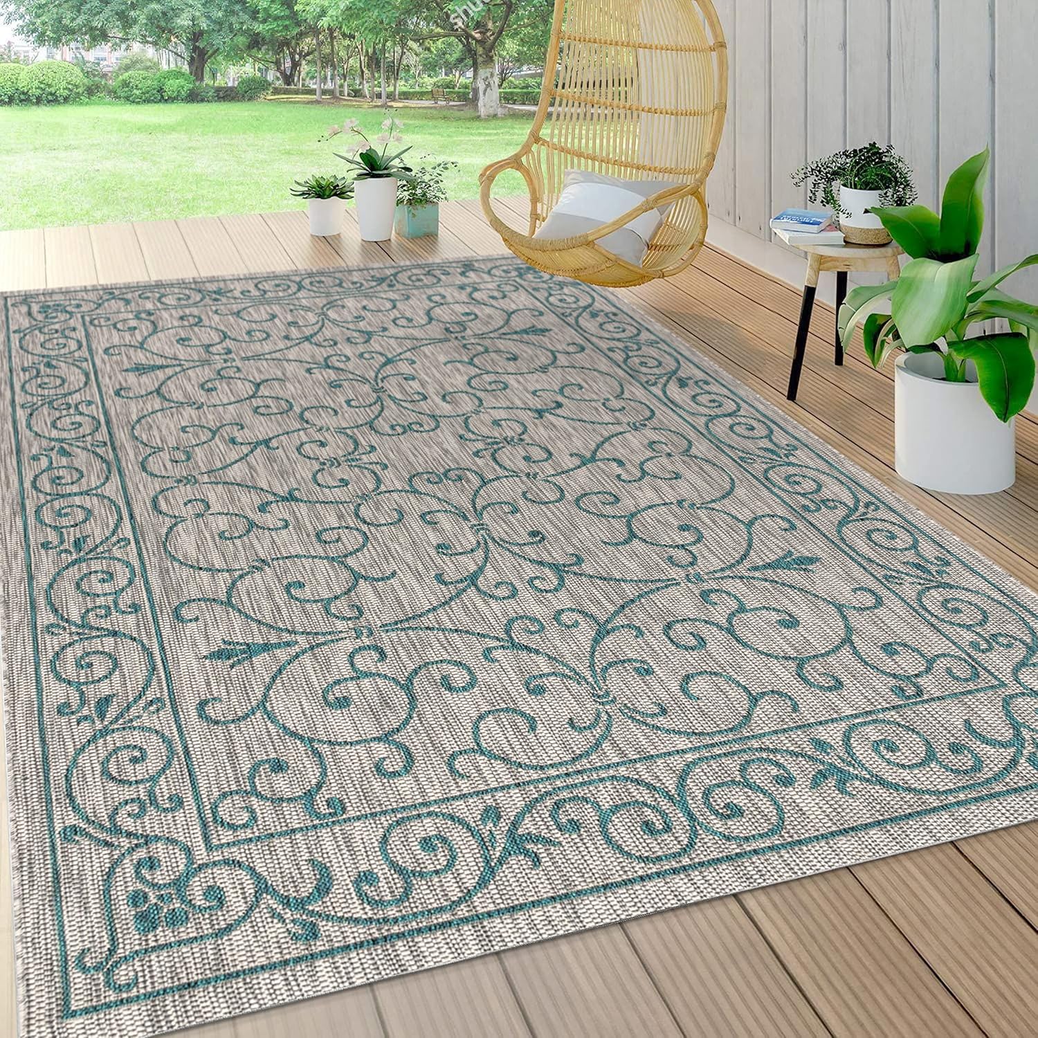 With a filigree design reminiscent of antique iron gates, our Boho-chic rug adds eclectic style to an outdoor porch or patio. Varied tones of navy and blue mingled with a gray pattern give this rug a hand-woven, vintage vibe. The flatweave design is great for high-traffic spaces indoors too.