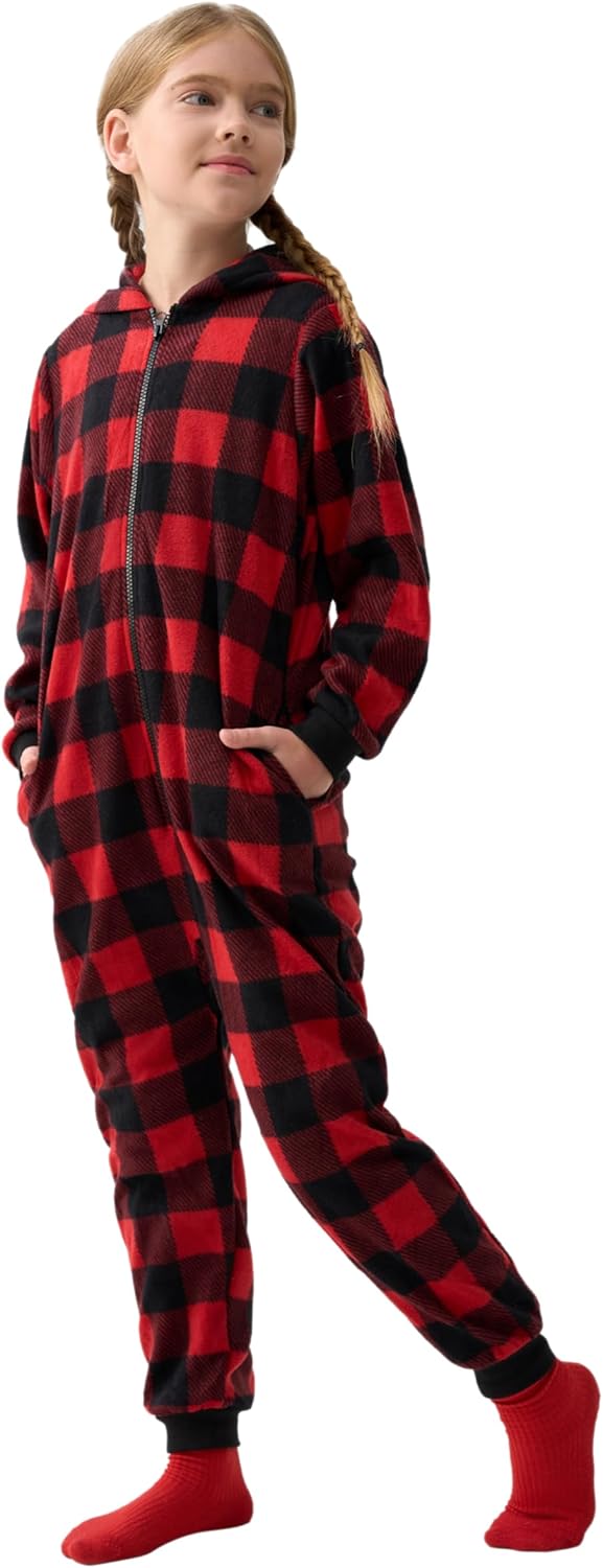 Giggling Getup Red Christmas Pajamas, Flannel Buffalo Plaid Pajamas with Hood for Holiday Jumpsuit