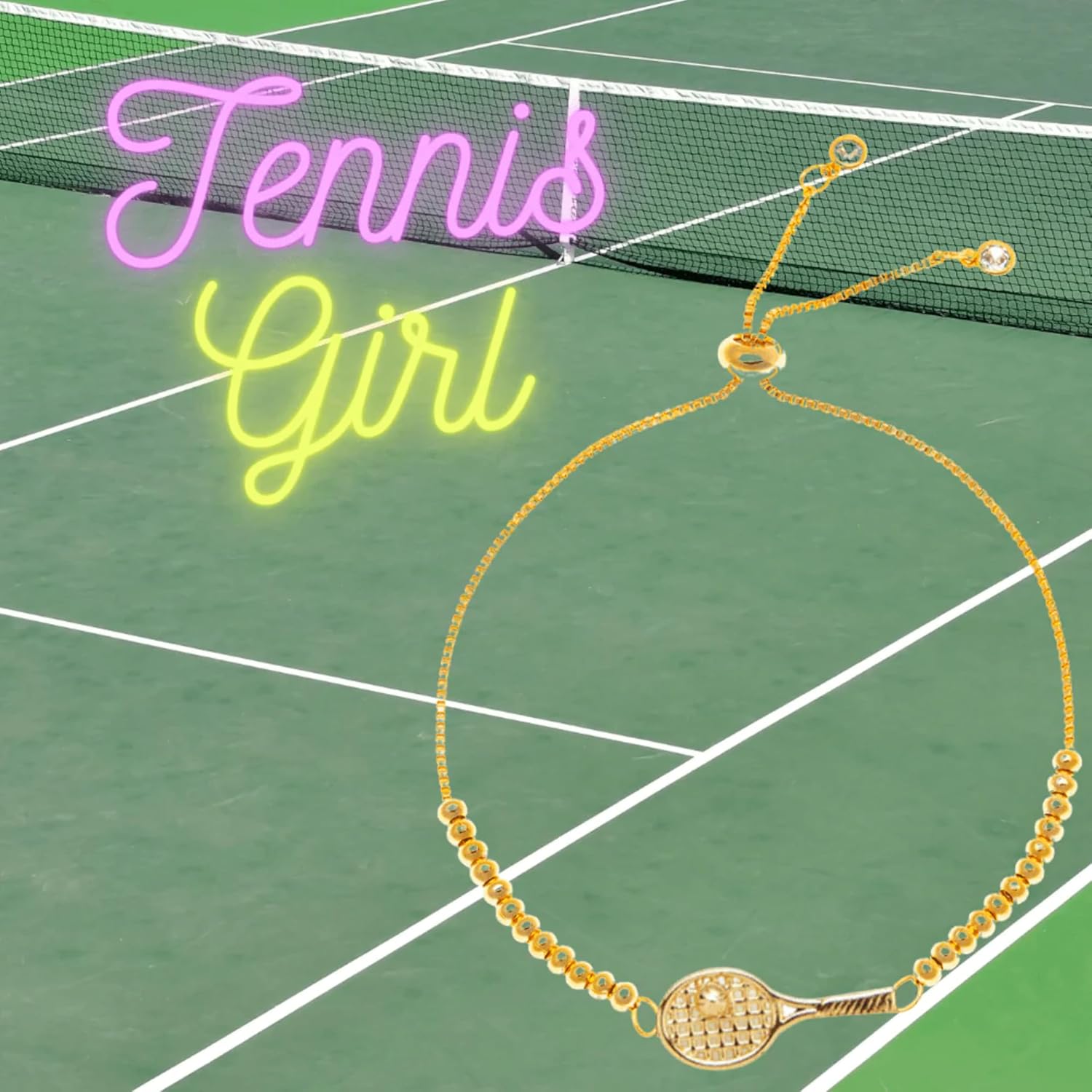 Add a sporty touch of elegance to your look with the Born to Rally Gold Ball Beaded Slider Tennis Racket Bracelet. Featuring a delicate beaded design with a gold-toned tennis racket charm, this adjustable slider bracelet blends athletic spirit with modern style. Whether you're on the court or out on the town, it's a subtle yet striking way to show your love for the game. The easy-to-adjust slider ensures a comfortable fit for all wrist sizes, making it a thoughtful gift for tennis players, coaches, and fans alike. Stylish, versatile, and full of character—this bracelet is made to rally with you.