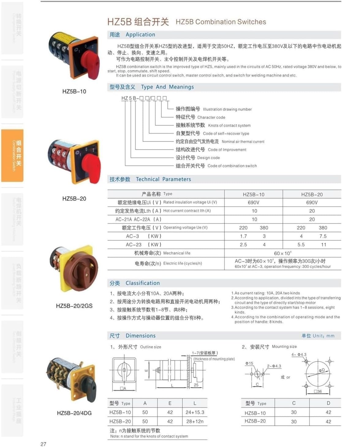 SwitchesProducts DescriptionName: HZ5B-20/2 changeover switch(20A, 2 Phase)Max voltage:380VMax current:20APosition number: 3 positionPhase number: 2Terminal number:8Material: Plastic/Silver contactApplication: Control motor