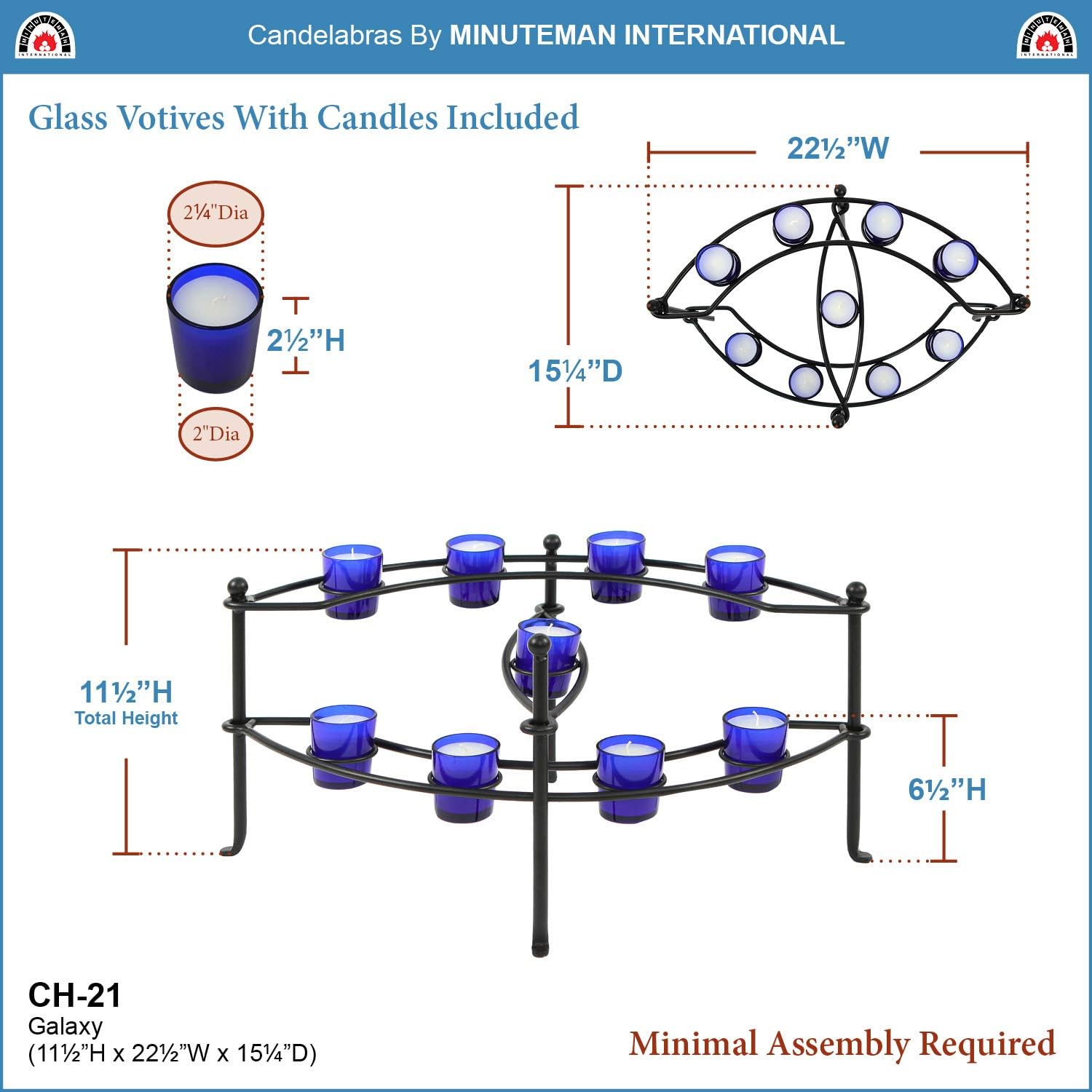Hearth candelabra provide the warm ambiance of a fire without heat or mess, and are an elegant way to enliven your fireplace when it is not in use, particularly during summer months. Their compact, elegant designs make them equally suitable for tables or sideboards. With a hearth candelabrum your fireplace will remain the focal point of your room all year long. Two tiers of ring candleholders are linked by a lozenge for a central candle, and raised up on four plain feet. Nine blue votive cups fitting into the rings are included. In Black powder-coated finish, suitable for indoor and outdoor use. (Candles not included)