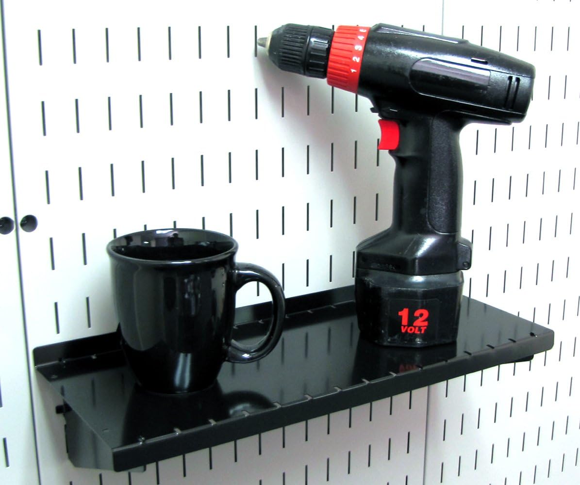 The Wall Control Pegboard 6in Deep x 16in Wide Pegboard Shelf Assembly for Wall Control's Pegboard and Slotted Tool Board is made from heavy duty 14 gauge steel and offers great pegboard shelf storage. Unlike most pegboard brands that fall short when it comes to shelving, Wall Control pegboard shelves are heavy-duty and up to the task with their solid construction and attractive finish. Wall Control Slotted Metal Pegboard Shelves and Supplies feature a scratch and rust resistant baked-on finish. These more secure and stable tool board accessories are for use with the slots found in Wall Control Metal Pegboard tool board panels only. Wall Control Slotted Tool board accessories offer a patented engagement that requires two deliberate motions up-and-down to engage and disengage the hooks. This feature makes Wall Control Slotted Pegboard accessories less likely to fall out of the tool board than conventional peg hooks that can easily fall off when tools are removed. Although Wall Control Metal Pegboard Panels will accept conventional 1/4in pegboard accessories as well as Wall Control Slotted Accessories the Slotted Secure Tool Board Shelf Assembly included here is only for use with Wall Control Metal Pegboard Panels and Tool Boards. Wall Control Pegboard Products are Made in the USA (1) Black 6in x 16in Pegboard Shelf Assembly for attachment to Wall Control pegboard tool boards. Wall Control Shelf Assemblies are not for use with Wall Control's 3in Tall Pegboard Strips. Wall Control Shelf Assemblies are ONLY compatible with Wall Control pegboard tool board panels.