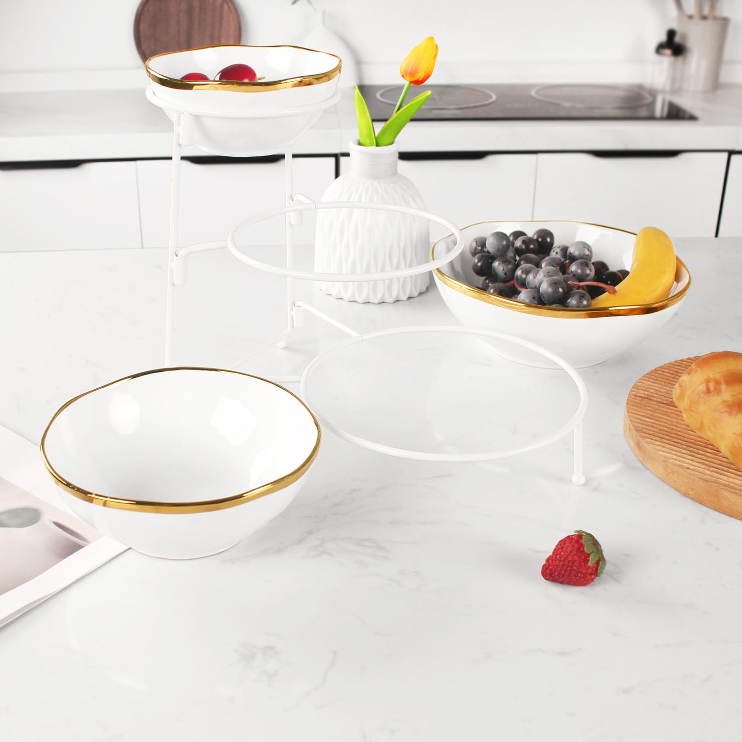 jinsongdafa Ceramic 3-Tier Serving Bowls with Foldable white Rack with 5.4"/6.8"/8.8" Gold Rim Bowls, for Food Display, Delicatessen, Fruit, Dessert, Decoration for Parties Entertaining ELEGANT DESIGN - This 3-tiered dining rack comes with beautiful white stands and 3 white porcelain serving bowls with gold rims. The gold on the rims of the porcelain bowls will not come into contact with food, so you can use them with confidence; Add a touch of style to any table setting. A variety of styles to choose from - our store has 2-tier and 3-tier serving trays, as well as 2-tier and 3-tier serving bowls, you can also use the porcelain serving bowl trays alone, which are perfect for parties, banquets, events, special occasions or any special occasions that require food to be displayed, making the entire entertainment more perfect. Large Capacity - 5.8-inch/6.8-inch/8.8-inch gold-rimmed large bowls provide ample space for appetizers, desserts, fruits, cooked food, etc. The three-tiered rack can beautifully display your food and is an ideal choice for entertaining guests or parties. Easy to Assemble and Clean - The stand can be easily assembled and disassembled for storage, saving kitchen space, the porcelain gold rim bowl is dishwasher safe and easy to clean; the edge of the porcelain gold rim bowl is gold-plated, washing in the dishwasher will dull the gold color, in order to permanently maintain the gold luster, we recommend: hand wash or wipe with a damp cloth, the surface of the porcelain gold rim bowl is smooth and easy to clean, just wipe with soapy water and a damp cloth to clean GIFT OPTIONS - Our packaging is excellent so each product reaches you safely, and its versatility makes it a perfect gift for various holidays, weddings, housewarming gifts, birthdays, Christmas, Thanksgiving or other special occasions.