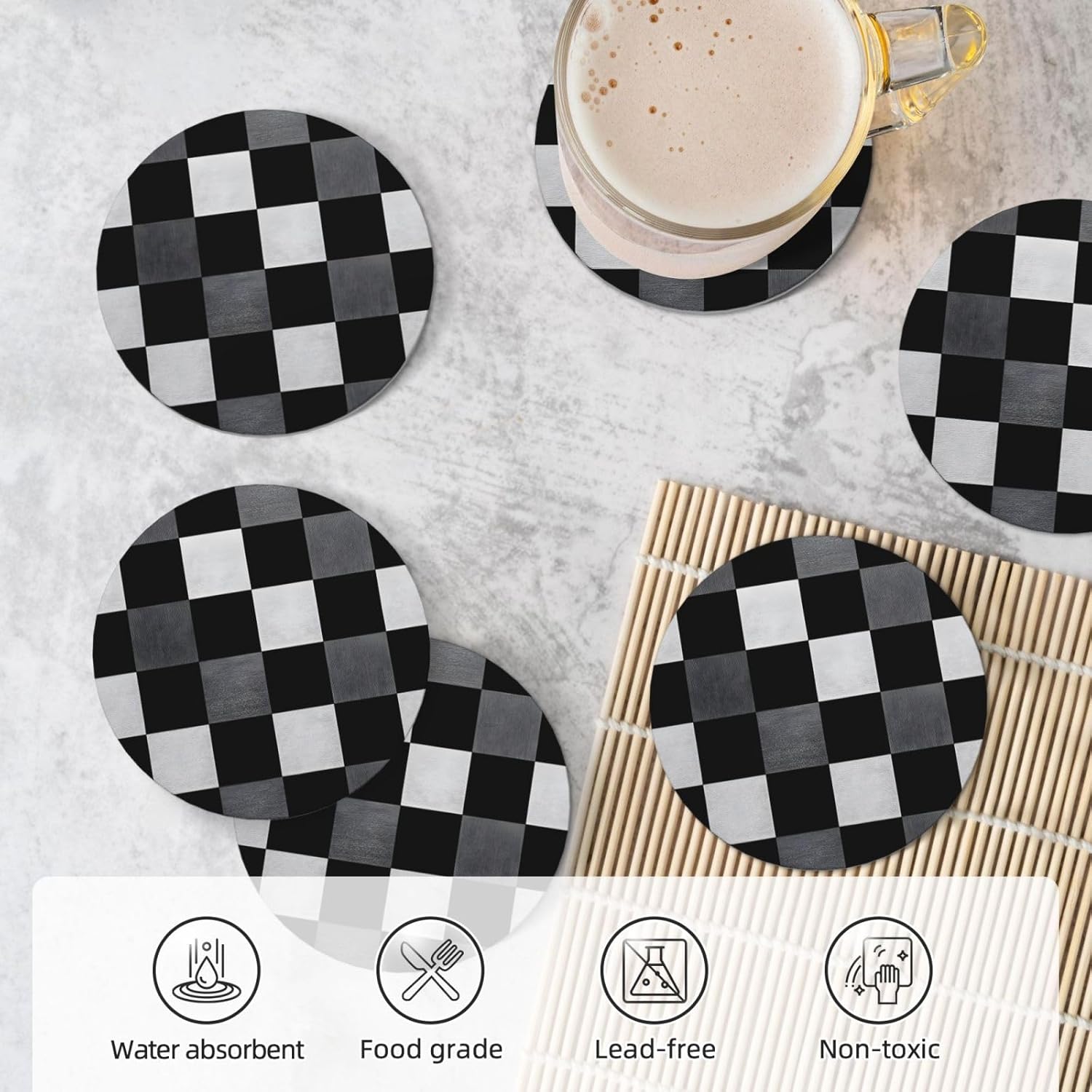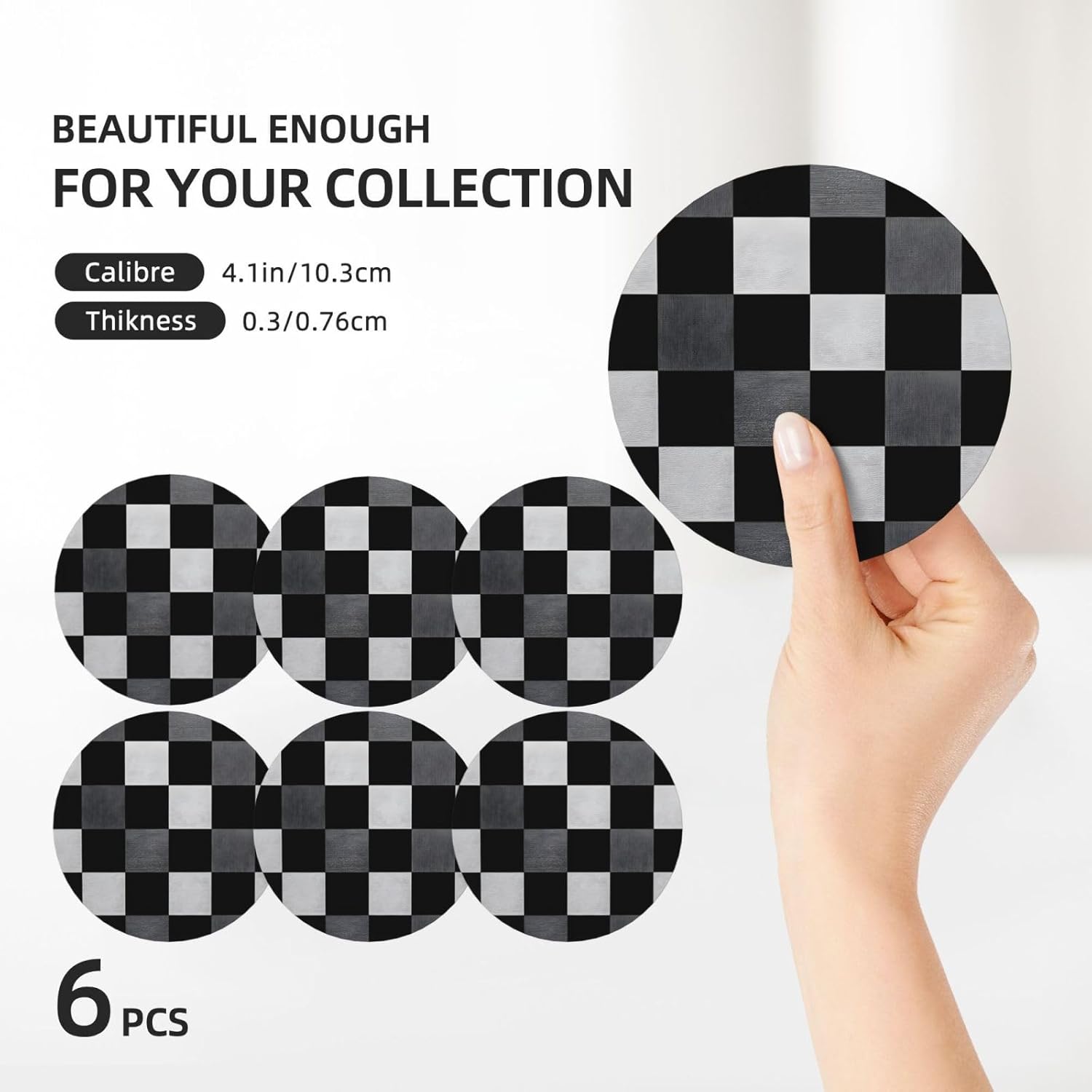 Product Name: DCEHGEW Ceramic Drink CoastersMaterial Type: Ceramic with cork bottomSize: Round: 4.1 x 4.1 inches, Square: 3.9 x 3.9 inches, Hexagon: 4.3 x 3.7 inchesPattern: checkerboard pattern About Our Ceramic Absorbent Coasters:Product Features - Crafted from high-quality ceramic, these coasters are odorless and eco-friendly. Their superior absorbency keeps your surfaces dry by quickly soaking up spills from coffee, cola, and other beverages within 10-15 seconds.Applicable Scenarios - Perfect for adding a stylish touch to your kitchen, living room, bar, hotel, or restaurant. These coasters are an ideal present for birthdays, Mother's Day, Father's Day, Valentine's Day, anniversaries, housewarming celebrations, or Christmas.Accessory Structure - Each set includes 6 ceramic coasters with cork bottoms, accompanied by a sleek black metal stand for organized and aesthetic storage. Choose from three different shapes to suit your style and needs.Washing Instructions - Easily clean these coasters with water or a damp cloth.Special NoteDue to different measurement methods, a deviation of up to 0.3 cm in size is considered normal.Please Note:The product images are for reference only. Actual products may vary slightly due to production factors such as batch differences and machine settings. Minor variations in color, position, and size are normal and not considered defects. Thank you for your understanding!Customer Service:We want to make sure you have an amazing experience with us. Please contact us with any feedback you may have. We love to hear from you and usually respond within 12-24 hours.