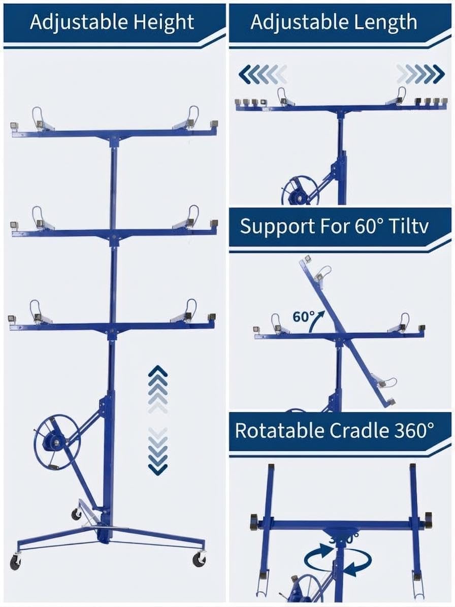 Introducing the Heavy-Duty Drywall Lift, the ultimate solution for effortless drywall installation. Designed to support up to 150 lbs, this drywall rolling lifter panel is perfect for lifting and positioning sheetrock with ease, making ceiling and wall installations faster and safer.Equipped with a 360° adjustable telescopic arm, this drywall jack lift allows for precise placement and adjustment of drywall panels, ensuring a perfect fit every time. The extension feature provides ample reach for a variety of project sizes, from small repairs to large-scale installations.The lift is built with three lockable wheels, offering excellent stability and mobility. You can easily maneuver the lift into position and lock it securely for safe operation, reducing the risk of accidents and damage to your materials.Key Features:- Heavy-duty construction supports up to 150 lbs, suitable for most drywall panels- maximum lift height with an telescopic arm for versatile use- 360° adjustable arm for precise drywall positioning- Three lockable wheels provide stability and easy mobility- Ideal for ceiling and wall drywall installationsThis drywall panel hoist is a must-have tool for contractors, DIY enthusiasts, and professionals looking to improve efficiency and safety on the job. Say goodbye to the hassle of manual lifting and enjoy smooth, controlled drywall installation with this reliable drywall lift. Order now and experience the convenience and durability of this premium drywall rolling lifter panel.