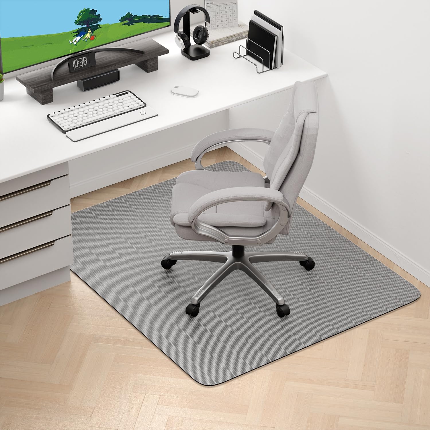 Hsurbtra Office Chair Mat A balance of utility and aesthetics Brightens up your workspace with elegant and beautiful design Product Specification: Material: PVC with rattan woven Dimensions: 35 x 47 Inch / 45 x 53 Inch / 47 x 59 Inch Thickness: 0.08 inch / 2 mm Package Included: 1 x Office Chair Mat Crease-Free Rolled Packaging Conveniently rolled packaging to ensure the chair mat remains flat without any creases when you use it Premium PVC Surface Crafted from high-quality PVC with a unique rattan-like woven patte The smooth chair mat surface facilitates smooth rolling of chairs without making any noise, creating a peaceful and focused work environment Non-Slip Rubber Backing Features a robust non-slip material on the bottom to keep the chair mat securely in place. Prevents chairs from sliding or moving unexpectedly, enhancing safety and stability Floor Protection The office chair mat provides effective protection for your hard floors, prolong their service life Easy to Clean Easy to clean and maintain, just clean with wet cloth or vacuum cleaner to remove stains and debris Multi-Purpose Utility Versatile enough to be used in various settings, including offices, homes, classrooms, and libraries Great Gift Idea Sleek and modern design complements any office decor, enhancing the overall aesthetics of your workspace. Great gift ideal for Women, Men, Girls, Coworkers, Moms, Birthday, Back to School, Thanksgiving Day, Christmas and more Enjoy the blend of protection, mobility, and elegance that perfectly suits your home office or gaming setup!