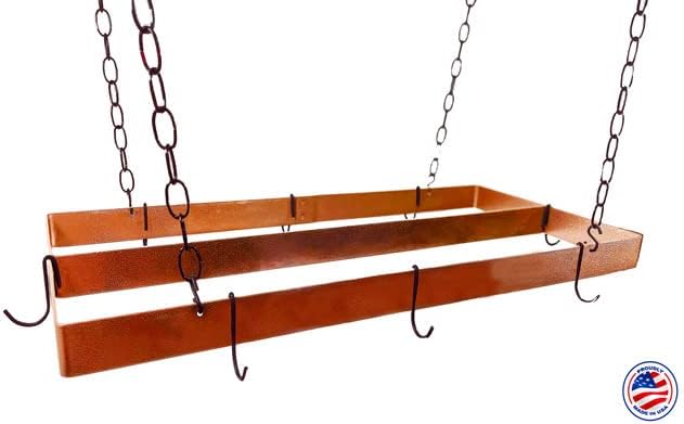 The Hammered Copper Rectangular Pot rack measures 30" x 15" with a centerbar measuring 30". Pot Rack includes 8 black regular pot rack hooks and black "S" hooks and chains for mounting.