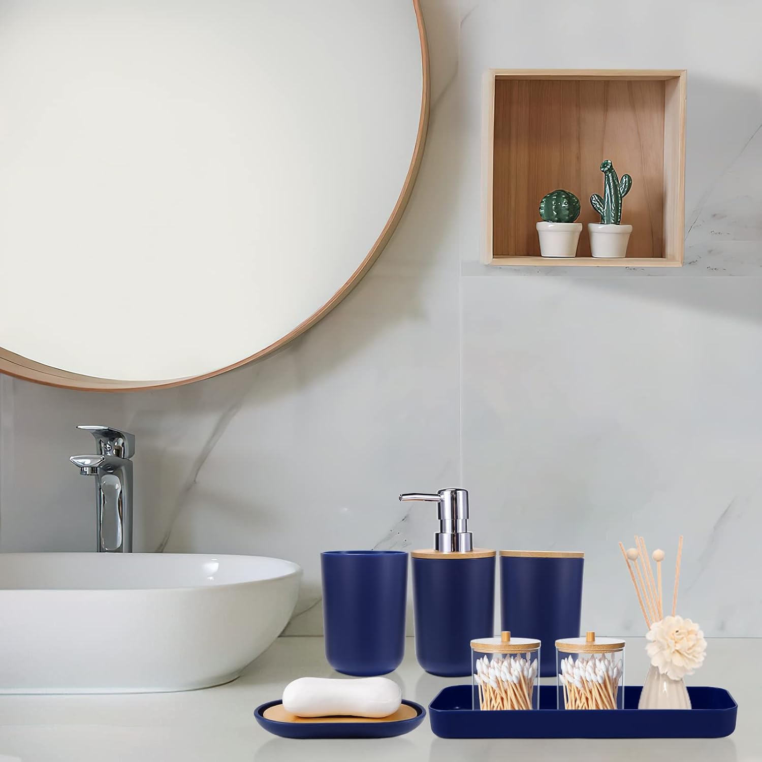 | Included Components | Soap Dispenser Soap Dish Toothbrush Holder Toothbrush Cup Trash Can Toilet Brush and Holder Tray Q-tip Holders |