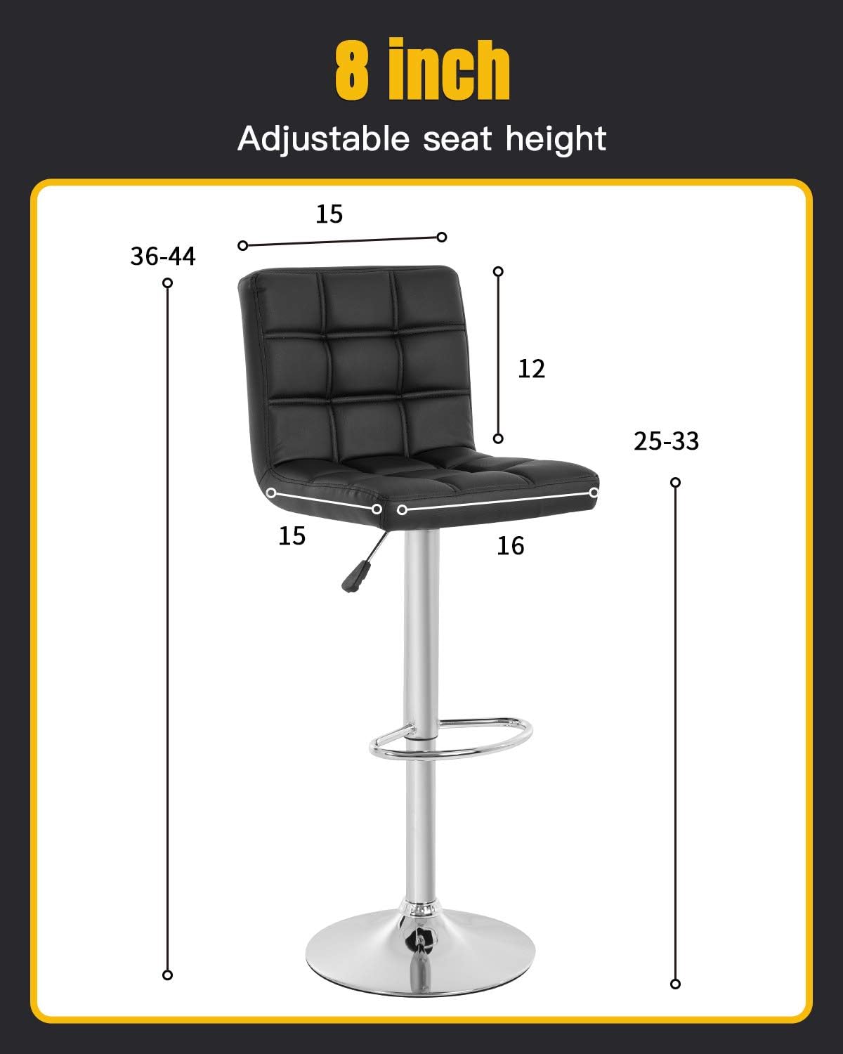 1、BLKMTY Bar Stool !(1)This bar stool combines an innovative and stylish design with great comfort and durability.(2)Due to their chic design, these bar stools are the ideal solution for commercial and home use. This will perfectly decorate your living room and also add a modern touch to your office, bar or restaurant. (3)You can put the bar stool 2-piece set anywhere and it will perfectly match the style of the other decorative items used. (4)The bar stool cushions are made of high-density foam and soft PU, and with the chrome-plated hard base, the adjustable stool gives you extra comfort. If you are looking for such swivel bar stools, you can choose our products and add more fun to your life. 2、Bar Stools Other Advantages: Luxurious and modern style; Metal height-adjustable handle; 360 degree swivel; Large weight capacity 250LBS; Wear resistant rubber ring; Comfortable footrest; Waterproof PU leather; 3、Bar Stools Specification: Color: Black; Material: Faux Leather; Overall height: 36-44 inches (to backrest); 25-33 inches (to cushion); Backrest size: 15 "D x 12 "W;Cushion size: 16 "D x 15 "W;Package Contents: 2 bar stools + installation manual; 4、Satisfactory Customer Service: (1)BLKMTY is committed to providing every customer with satisfactory products and services, if you have any questions or need help, you can always contact us, we are happy to provide you with excellent service. (2)If the package is missing instructions or parts (which is highly unlikely), please contact us immediately. We will send you the required parts by various means. (3)We have a well-trained customer service team that can get back to you and help you in a short time, aiming to give our customers a better shopping experience.